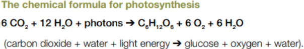 The equation above is the chemical reaction of photosynthesis; the top line contains the individual molecules that are taking part and corresponds with the word equation underneath. Some of the molecular formulas you might recognise - CO2 as carbon dioxide (a carbon atom bound to two oxygen atoms), H2O as water (two hydrogen atoms bound to an oxygen atom) and pure oxygen O2. Other molecules, such as glucose (C6H12O6) might be less familiar but is a common form of sugar in plants and animals. We can also see from the equation why plants need water to grow; it is part of the photosynthesis reaction. When light energy from the sun (photons) hits the leaf of a plant, its power splits the water in the plant into hydrogen and oxygen. The oxygen is released from the plant and the hydrogen goes on to bind with carbon dioxide from the air to produce glucose which is stored.